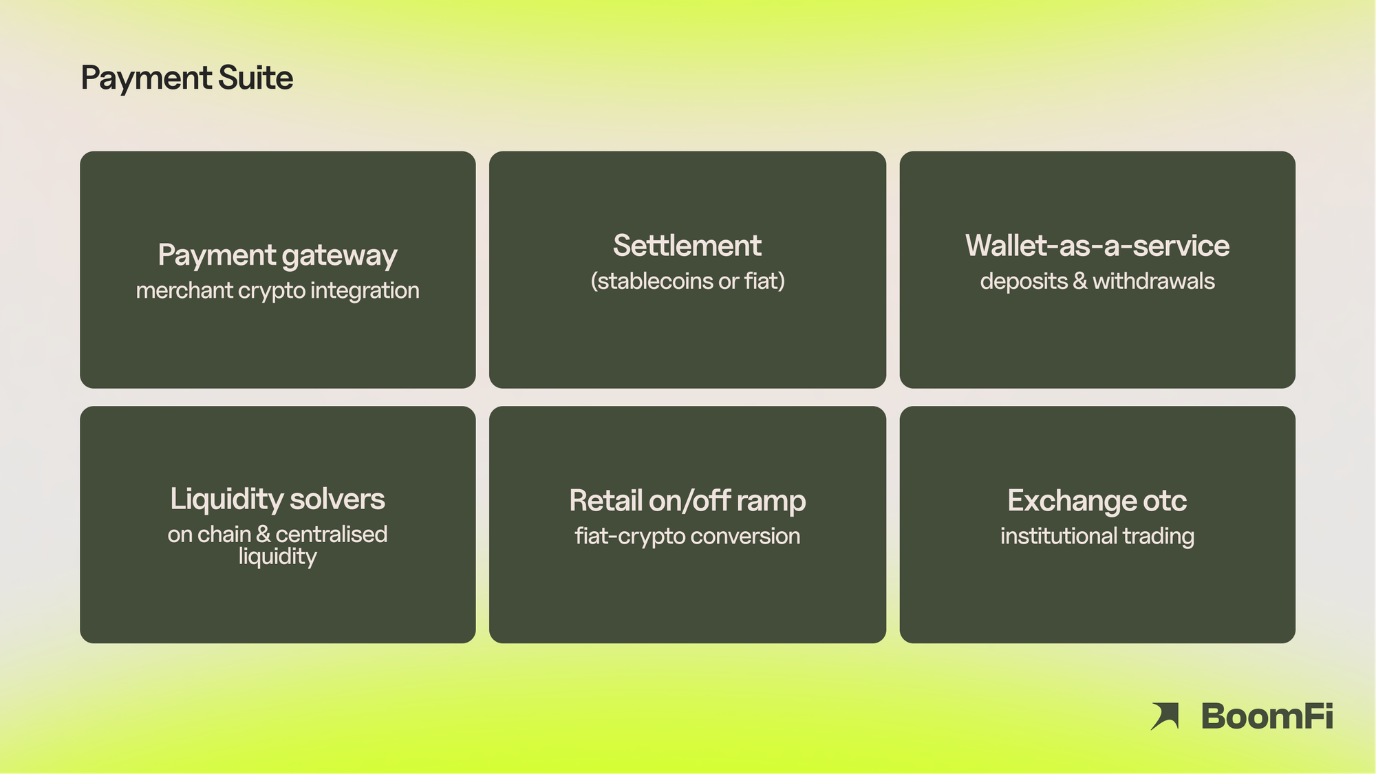 BoomFi's solutions bridge the gap between technical complexity and practical business needs. For businesses ready to accept crypto payments directly, our platform provides both developer-friendly APIs for customized integration and no-code solutions like Paylink for immediate deployment without technical knowledge. For fintech looking to embed crypto capabilities, we offer modular infrastructure components—from crypto APMs (Alternative Payment Methods) to stablecoin settlement and wallet infrastructure—that can be seamlessly integrated into existing payment stacks.