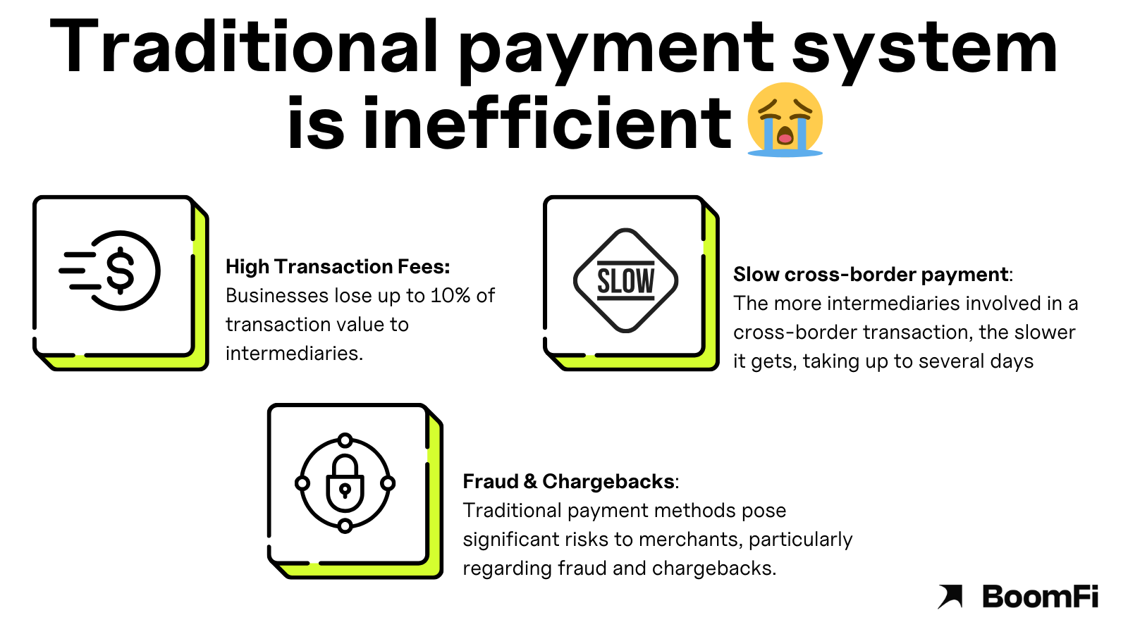 Traditional payment methods are clearly inadequate for both businesses and consumers. The current global commerce environment demands an upgraded global payments system, as cross-border transactions face numerous obstacles, including excessive transaction fees, long processing times, and security concerns.